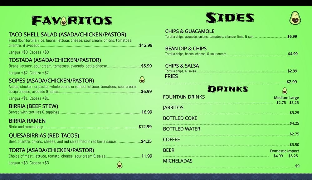 Asada, chicken, or pastor. Lettuce, tomato, avocado, cheese, sour cream & red or green salsa.